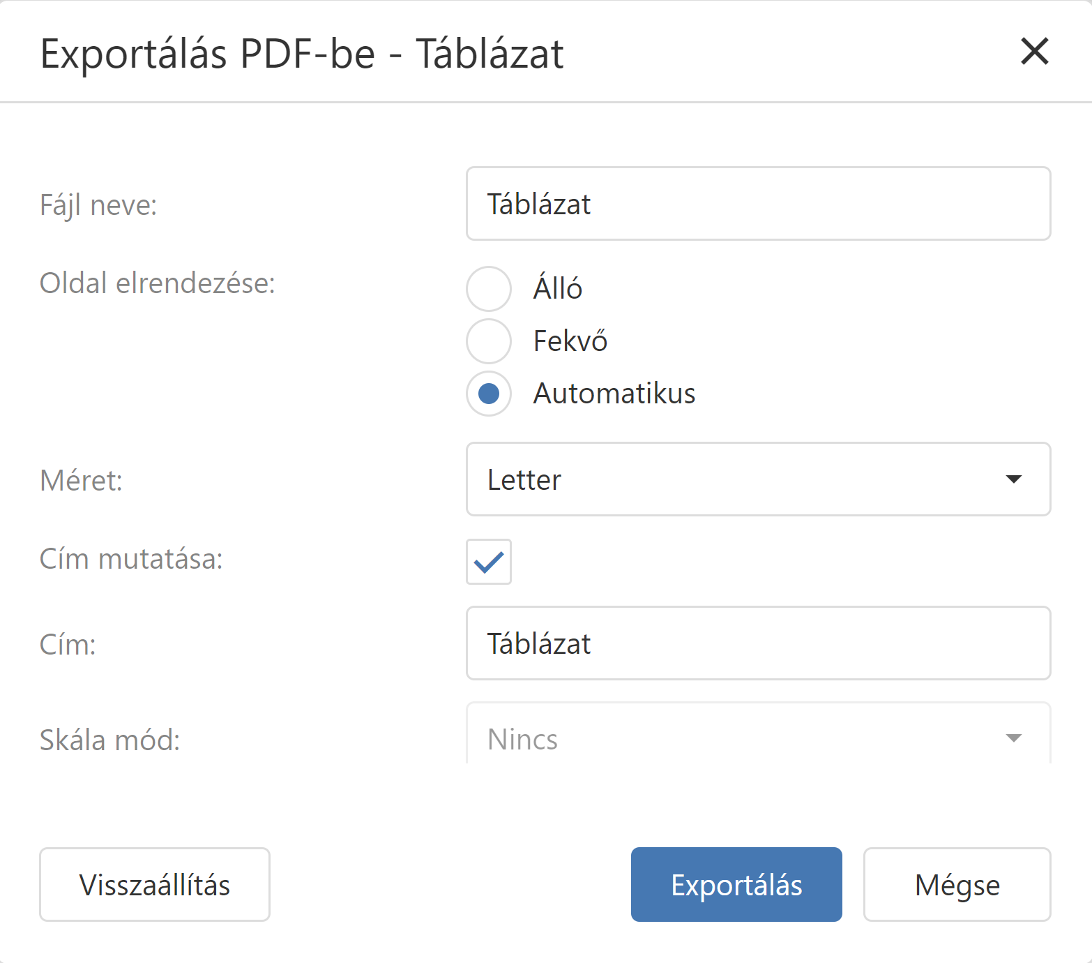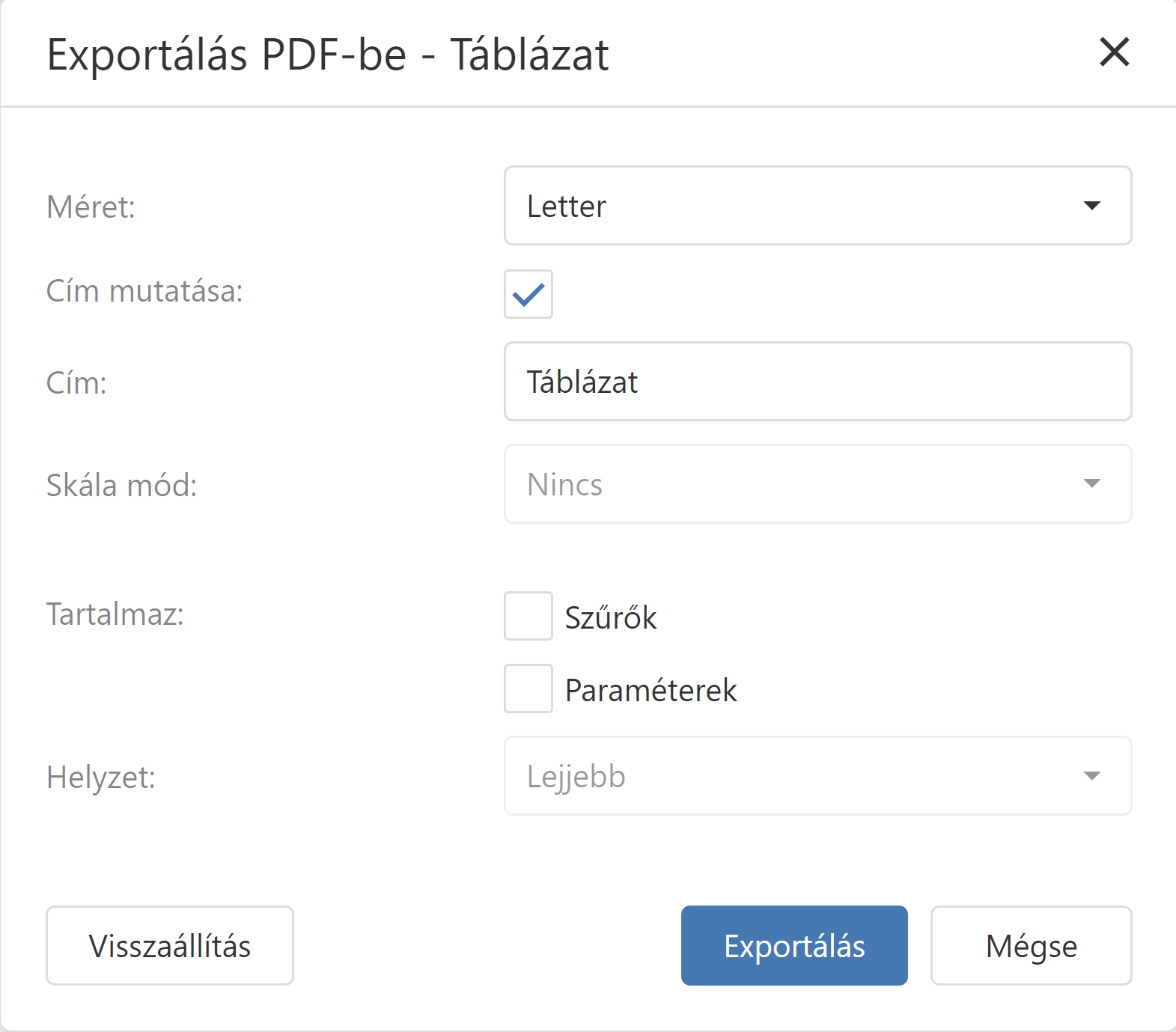 A szükséges paraméterek kiválasztása után az gombra kattintva exportálhatja a táblázatot PDF fájlba. Az alapértelmezett értékek visszaállításához kattintson a gombra. |