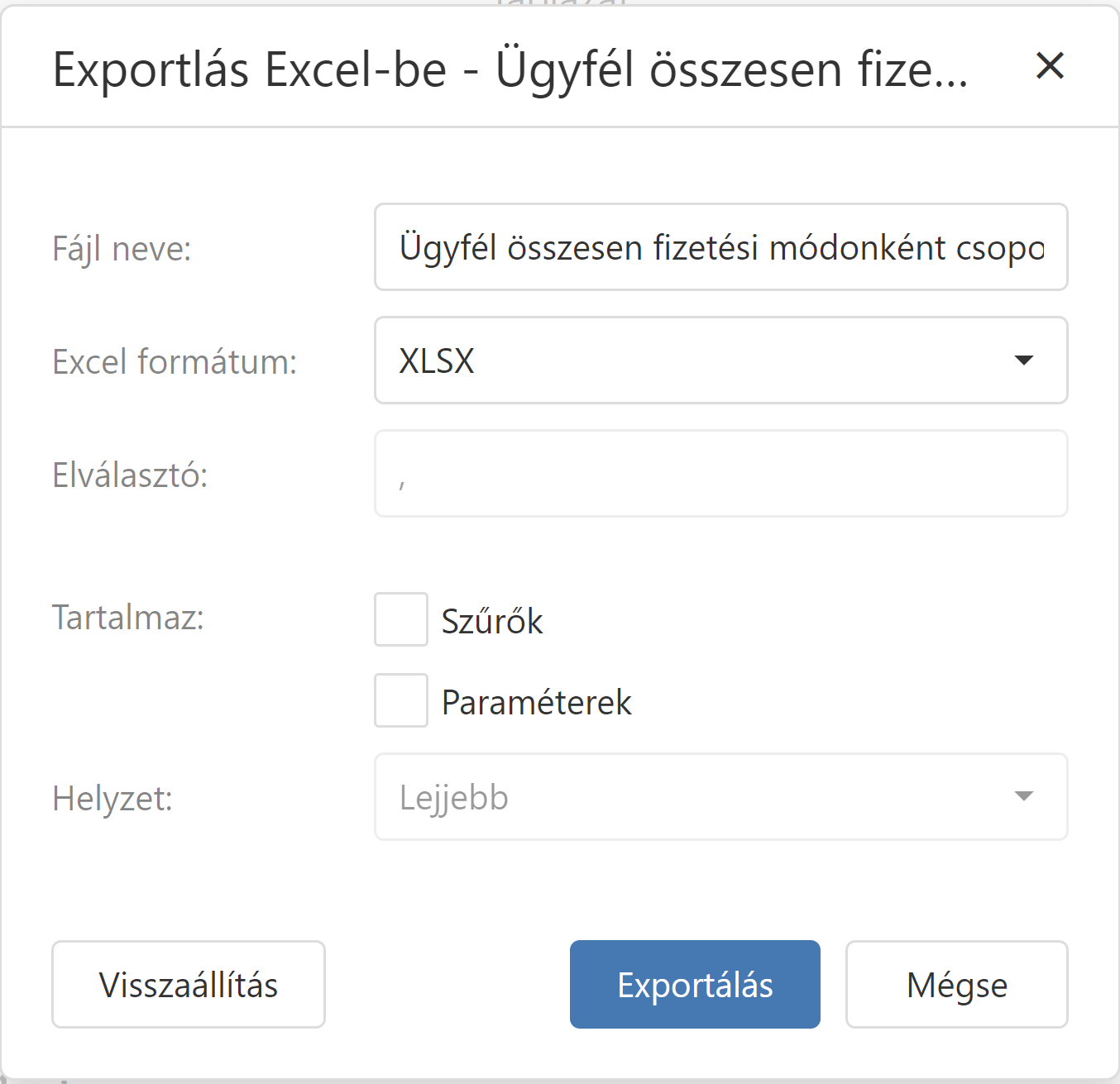 •Fájl neve - Adja meg az exportált Excel fájl nevét. •Excel formátum - Megadhatja az Excel munkafüzet formátumot, amelyben a táblázat adatait exportáljuk. Választhat az XLSX és az XLS formátumok között. •Elválasztó - CSV fájl esetén megadhatja, hogy milyen karakterrel legyenek elválasztva az értékek •Tartalmaz | Szűrők - Lehetővé teszi, hogy főszűrő értékeket vegyen fel az exportált dokumentumba. •Tartalmaz | Paraméterek - Lehetővé teszi paraméterértékek felvételét az exportált dokumentumba. •Helyzet - Megadhatja a Szűrők és a Paraméterek helyzetét az exportált dokumentumban. Választható Lejjebb és Külön oldal.
