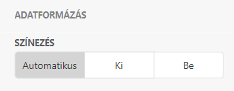 Értékek színezése 'Automatikus' - A műszerfal kezeli a kategóriák színezését. •'BE' - Manuálisan beállíthatóak a színek. Részletek a színezésnél. •'KI' - Nincsenek eltérő színek a grafikonon.