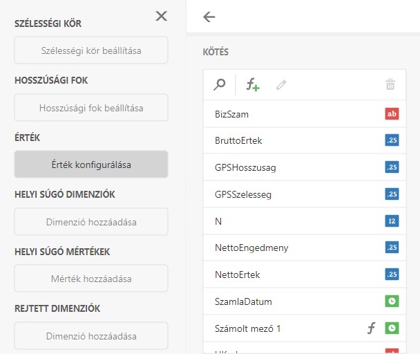 KötésFöldrajzi Pont Térképünkbe a választott eredményhalmaz oszlopai közül emelhető be a kívánt kategória. Nagy mennyiségű oszlop esetén lehetőség van a nagyító ikonnal keresni az elemek között.