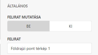 ÁltalánosFelirat mutatása•'BE' - A diagram fejléce fölött megjelenik egy tetszőlegesen megadott cím. •'KI' - A diagram felett cím nem látható. FeliratA Földrajzi Pont Térképnek megadott tetszőleges cím, amely a fejléc felett jelenik meg. |