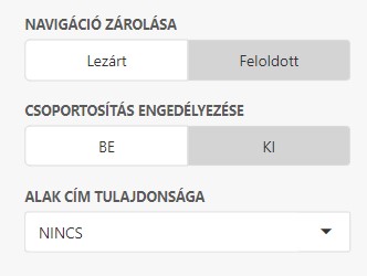 Navigáció zárolása•'Lezárt' - A térkép navigációja zárolás alatt van, nem tudjuk mozgatni a térképet. •'Feloldott' - A jobb egérgombot lenyomva lehetőségünk van húzni a térképet. Csoportosítás engedélyezése •'BE' - Csoportosítva, egy pontban jelennek meg az értékek. •'KI' - Külön jelennek meg az értékek. Alak cím tulajdonsága DEF |
