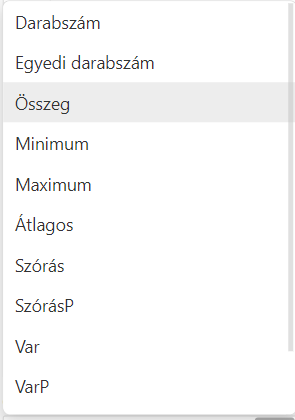 Összegzés típusaItt adható meg az aggregáció típusa a választott oszlopra. Pl. összeg. |