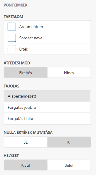 PontcímkékTartalom •'Argumentum' - Kategóriák nevének megjelenítése az X és Y tengely értékeinek metszéspontján. •'Sorozat neve' - Az adatsorok nevének megjelenítése az X és Y tengely értékeinek metszéspontján. •'Érték' - Az grafikon y tengelyéhez tartozó értékek megjelenítése az X tengely minden pontján.