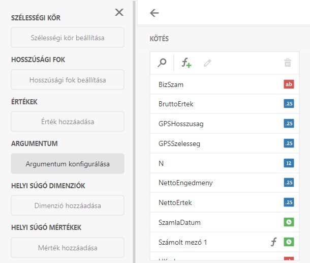 KötésKördiagramtérképünkbe a választott eredményhalmaz oszlopai közül emelhető be a kívánt kategória. Nagy mennyiségű oszlop esetén lehetőség van a nagyító ikonnal keresni az elemek között.