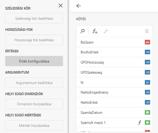 KötésKördiagramtérképünkbe a választott eredményhalmaz oszlopai közül emelhető be a kívánt kategória. Nagy mennyiségű oszlop esetén lehetőség van a nagyító ikonnal keresni az elemek között.