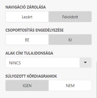 Navigáció zárolása•Navigáció zárolása •'Lezárt' - A térkép navigációja zárolás alatt van, nem tudjuk mozgatni a térképet. •'Feloldott' - Jobb egérgombot lenyomva lehetőségünk van módosítani a térkép elhelyezkedésén húzni a térképet. Csoportosítás engedélyezése •'BE' - Csoportosítva, egy pontban jelennek meg az értékek. •'KI' - Külön jelennek meg az értékek. Alak cím tulajdonsága DEF Súlyozott Kördiagramok •'IGEN' - def •'NEM' - def |