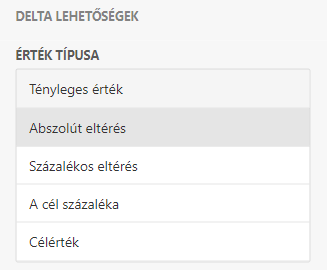 Delta lehetőségekÉrték típusa Megadhatjuk milyen érték szerepeljen a Műszer alatt: •Tényleges érték - Az érték, amit először megadunk. •Abszolút eltérés - Tényleges érték és a Célérték közötti eltérés. •Százalékos eltérés - Tényleges érték és a Célérték közötti százalékos eltérés. •A cél százaléka - Hány százaléka a Tényleges érték a Célértéknek. •Célérték - A Célérték jelenik meg.