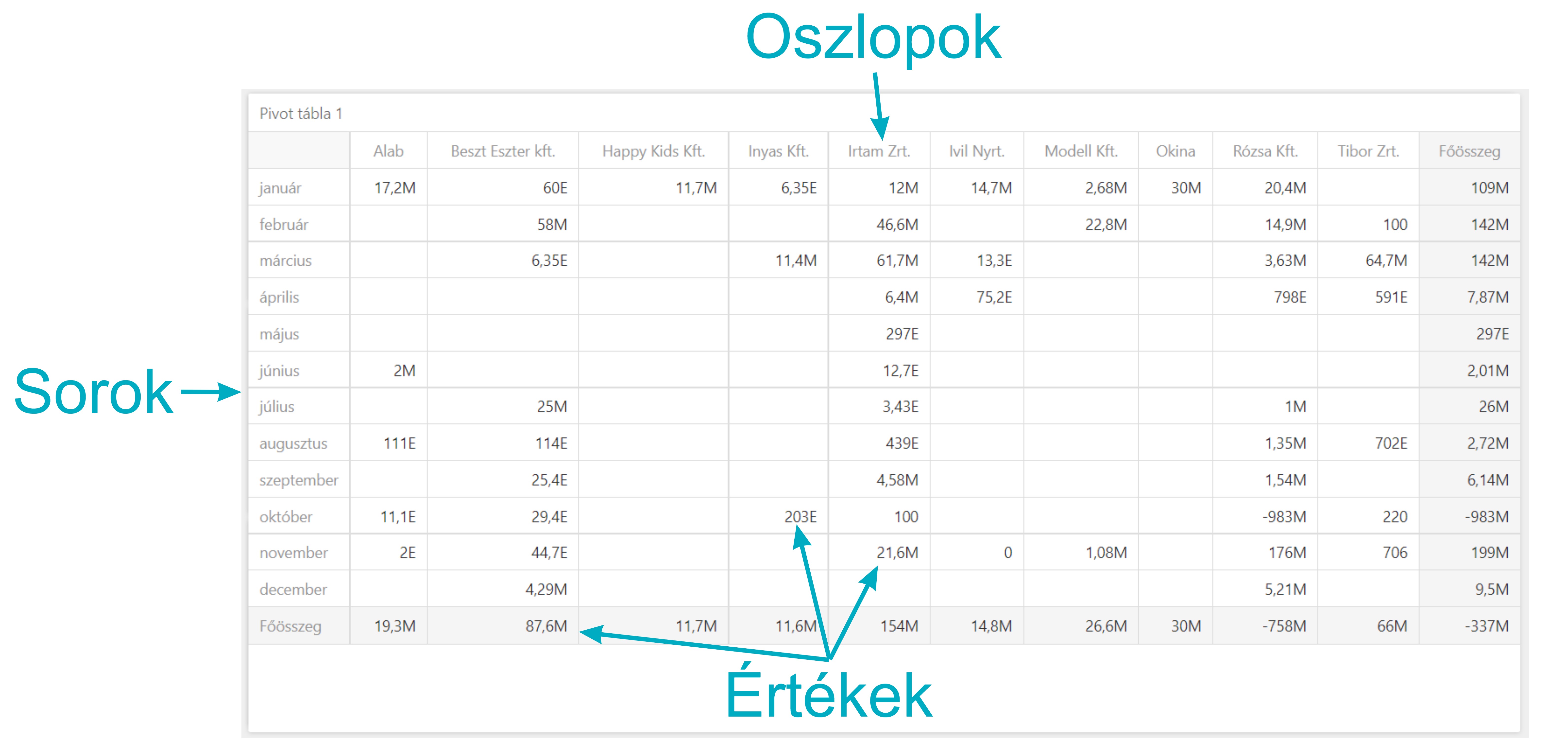 Értékek•A Pivot tábla számszerű értékeit képző oszlopok. |