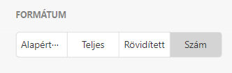 FormátumFormátum típus •'Automatikus' - A műszerfal dönti el, hogy milyen formában jeleníti meg az értéket. •'Általános' - Szöveges formátum, nincs formázás. •'Szám' - Szám megjelenítése •'Valuta' - Pénznem megjelenítése •'Tudományos' - Tudományos megjelenítés •'Százalék' - Százalékos megjelenítés Egység •Szám és Valuta formátum esetén megadható, hogy az adatok egy, ezer, millió, vagy milliárd valutaegységre kerekítve jelenjenek meg Pontosság •Szám, Valuta, Tudományos és Százalék formátum esetén megadható, hogy hány tizedesjegy jelenjen meg. Csoportelválasztó beillesztése •Beállítása esetén nem folynak össze az adatok, hanem a számjegyek mennyiségtől függően csoportosítva jelennek meg. Pl. 1000 helyett 1 000 formában. Valuta •Megadható a pénznem. |