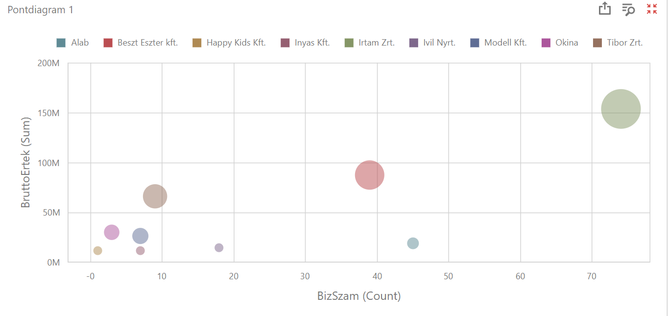 A Pontdiagram műszerfal elem az X tengely és Y tengely mentén jeleníti meg az adatokat, pontok segítségével. A témát részletesen is bemutatjuk az Adatok lekérdezése Pontdiagram témaköre alatt. |