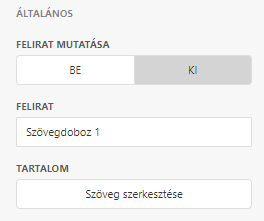 ÁltalánosFelirat mutatása•'BE' - A Szövegdoboz fejléce fölött megjelenik egy tetszőlegesen megadott cím. •'KI' - A Szövegdoboz felett cím nem látható. FeliratA Szövegdoboznak megadott tetszőleges cím, amely a fejléc felett jelenik meg. TartalomSzerkeszthetjük a Szövegdobozban szereplő tartalmat. |