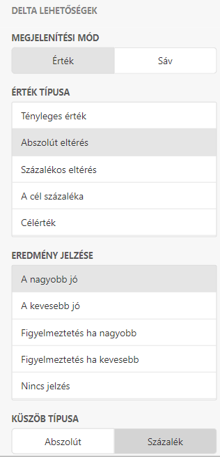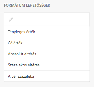 •'Tényleges érték' - Az aktuális oszlopban található érték jelenik meg. •'Abszolút eltérés' - Kiszámolt eltérés számszerű megjelenítése (Cél oszlop értéke - Aktuális oszlop értéke). •'Százalékos eltérés' - Kiszámolt eltérés százalékos megjelenítése. •'A cél százaléka' - Megmutatja, hogy az aktuális oszlop értéke hány százaléka a cél oszlop értékének. •'Célérték' - A célértéket mutatja.