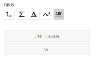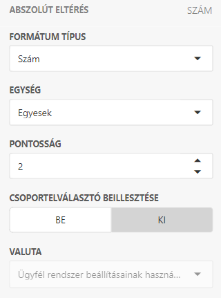 Formátum típus •'Automatikus' - A műszerfal dönti el, hogy milyen formában jeleníti meg az értéket. •'Általános' - Általános, szöveg, nincs formázás. •'Szám' - Szám megjelenítése •'Valuta' - Pénznem megjelenítése •'Tudományos' - Tudományos megjelenítés •'Százalék' - Százalékos megjelenítés