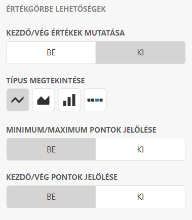 Kezdő/Vég értékek mutatása•'BE' - A görbe kezdeténél és végénél megjelennek az odatartozó számértékek •'KI' - Csak a görbe jelenik meg. Számok nem. Típus megtekintése•A görbe helyett megjelenhet oszlop, terület, sáv vagy nyereség/veszteség. Minimum Maximum pontok jelölése•'BE' - Világító ponttal kiemelésre kerül a görbe legnagyobb és legkisebb pontja. •'KI' - Nincs kiemelés a legnagyobb és legkisebb pontra. Kezdő/Vég pontok jelölése•'BE' - Világító ponttal kiemelésre kerül a görbe első és utolsó pontja. •'KI' - Nincs kiemelés az első és utolsó pontra. |