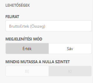 Lehetőségek![]() ![]() ![]() Felirat • Megváltoztathatjuk az eredményhalmaz elemének nevét a ráutaló hivatkozásokban. Megjelenítési mód •'Érték': Számban kifejezve jeleníti meg az oszlopban az értékeket. •Sáv: Az értékeket arányosan egy sávban jeleníti meg. Mindig mutassa a nulla szintet •'BE' •'KI' |