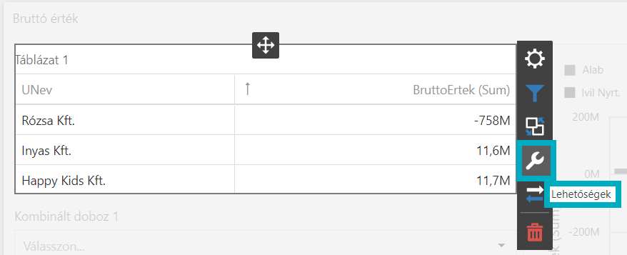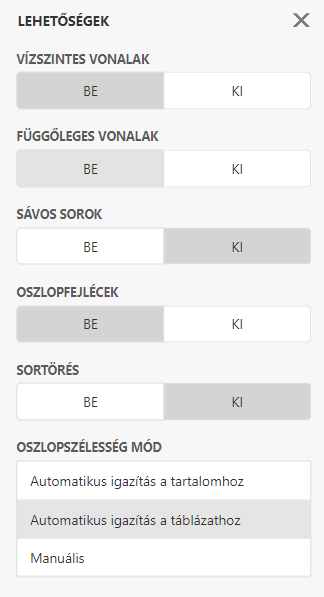 A Táblázatra kattintva bal oldalon megjelenő eszközsávon tudjuk kiválasztani a Lehetőségeket, amit a Lehetőségek beállításai táblázatban részletezünk. |