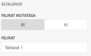 ÁltalánosFelirat mutatása'BE' - A Táblázat fejléce fölött megjelenik egy tetszőlegesen megadott cím. 'KI' - A Táblázat feletti cím nem látható. FeliratA Táblázatnak megadott tetszőleges cím, amely a fejlécek felett jelenik meg. |