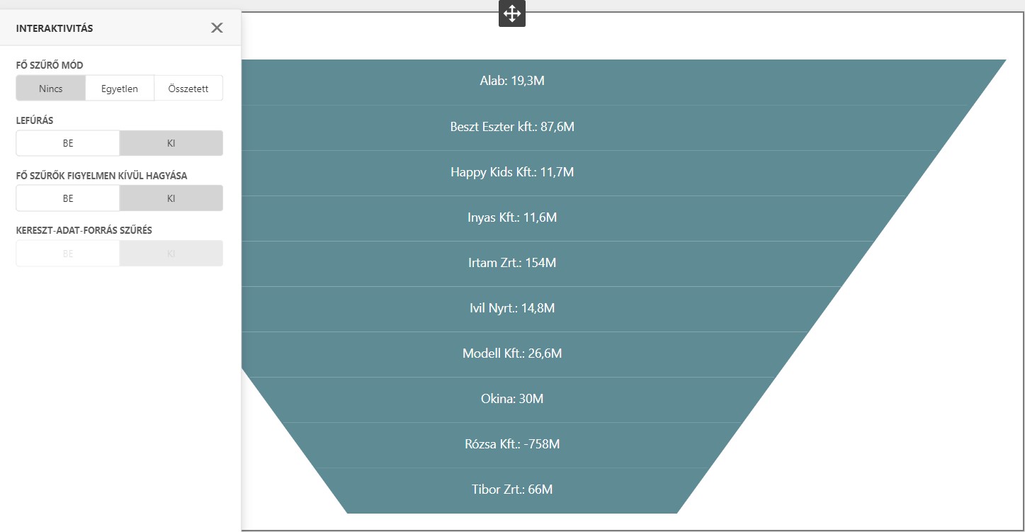 Fő szűrő módNincs•Nem lehet szűrni a D3 tölcsér elemeire. Egyetlen•A D3 tölcsér egy választott elemével szűrhetünk a Műszerfal más elemeire. Összetett•Több eleme is kiválasztható a D3 tölcsérnek más diagramok szűréséhez. Több sor választásához a diagram jobb felső sarkában lévő pipa ikonra kell kattintani. |