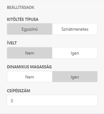 BeállításokKitöltés típusa •Egyszínű: •Színátmenetes: Ívelt - Beállíthatjuk, hogy látható vagy rejtett legyen a felirat. •Nem: A tölcsér formája egyenes •Igen: A tölcsér formája ívelt. Dinamikus magasság •Nem: DEF •Igen: DEF Csípésszám - DEF |
