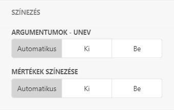 Színezés•Argumentumok Kategóriánként eltérő színeket kérünk. •Mértékek színezése Értékdimenziónként eltérő színeket kérünk. |