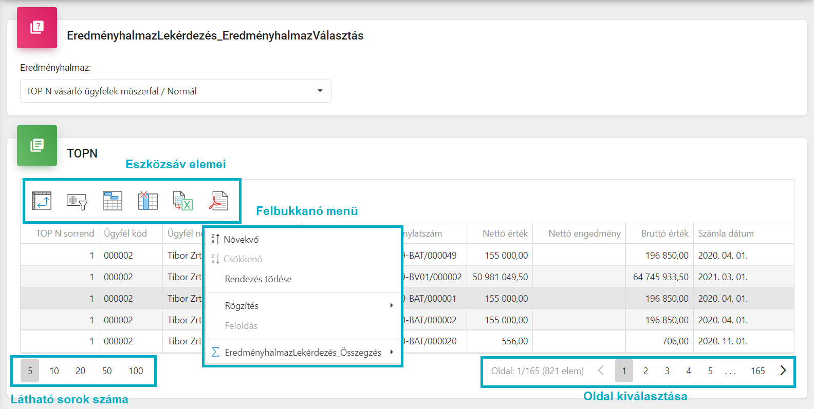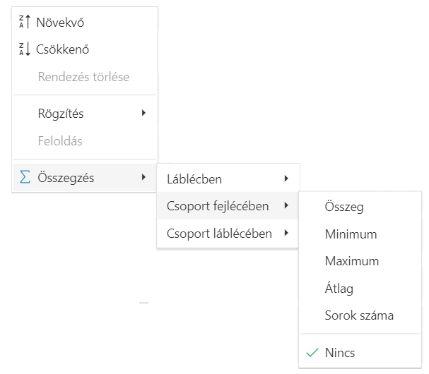 NövekvőA gombra kattintva növekvő rendezést érhetünk el. CsökkenőA gombra kattintva csökkenő rendezést érhetünk el. Rendezés törléseLehetőségünk van a korábban beállított rendezést törölni RögzítésJobb és baloldalon is rögzíthetjük az oszlopokat. FeloldásFeloldhatjuk a rögzítést. ÖsszegzésMegjeleníthetjük az oszlophoz tartozó összeget, minimum értéket, maximum értéket, átlagot, sorok számát a láblécben, a csoportláblécben, illetve a csoportfejlécben is. •Láblécben látjuk az összegzett adatokat. •Csoport fejlécében látjuk az összegzett adatokat. •Csoport láblécében látjuk az összegzett adatokat. •Összeg - Az oszlop adatainak összegét jelenítjük meg. •Minimum: Az oszlop minimum értékét jelenítjük meg. •Maximum: Az oszlop maximum értékét jelenítjük meg. •Átlag: Az oszlop átlagát jelenítjük meg. •Sorok száma: Az oszlopban található sorok számát jelenítjük meg. •Nincs: Nincs összegzés.