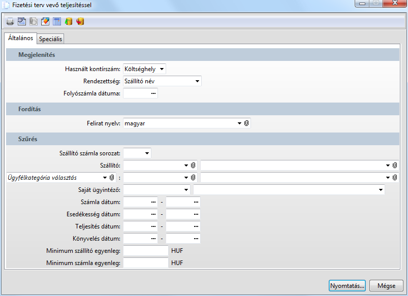 A funkció a fizetendő szállítószámlákat listázza, az azonos költséghelyre, témaszámra, pozíciószámra könyvelt vevő számlákkal és azok kiegyenlítettségével együtt. Így láthatjuk, hogy egy fizetendő számlához kapcsolható bevétel megérkezett-e már vagy nem.