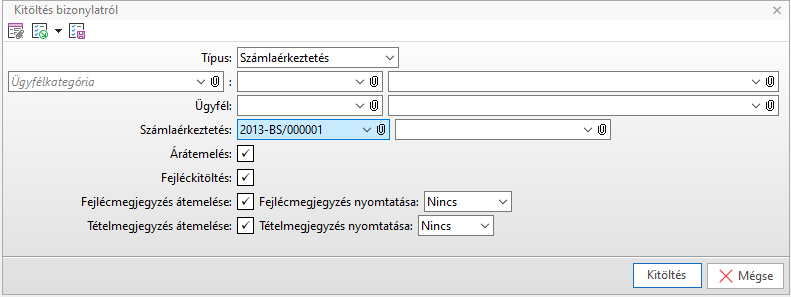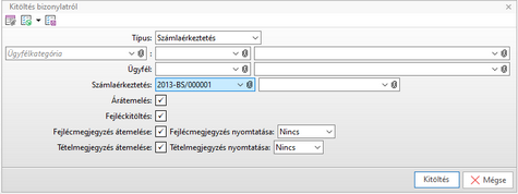Választás után automatikusan kitöltésre kerül a számla fejléce és tételei a választott bizonylat adatai alapján. A művelet megegyezik a vevő számlában leírt Kitöltés bizonylatról művelettel. A művelet sztornó és helyesbítő számlák rögzítésekor nem aktív.