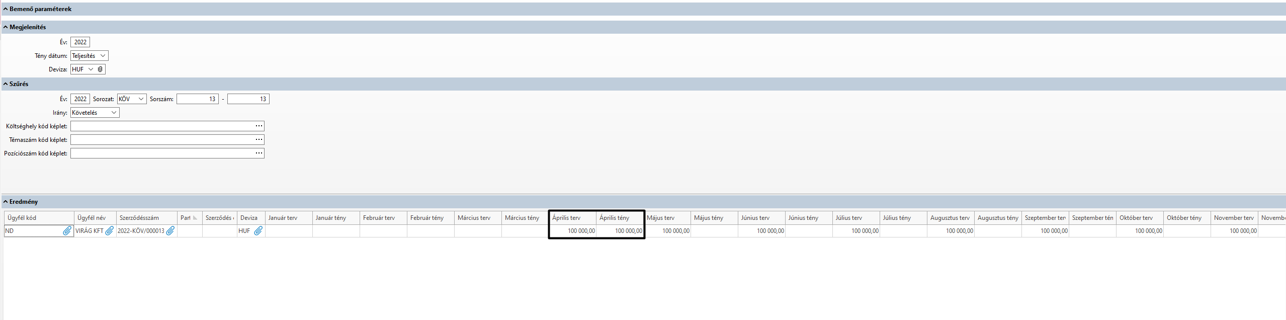 Az eredményhalmazban kijelölt április hónap tervezett és tény összege ellenőrizhető a szerződések tételén megtalálható Terv-tény fülön.