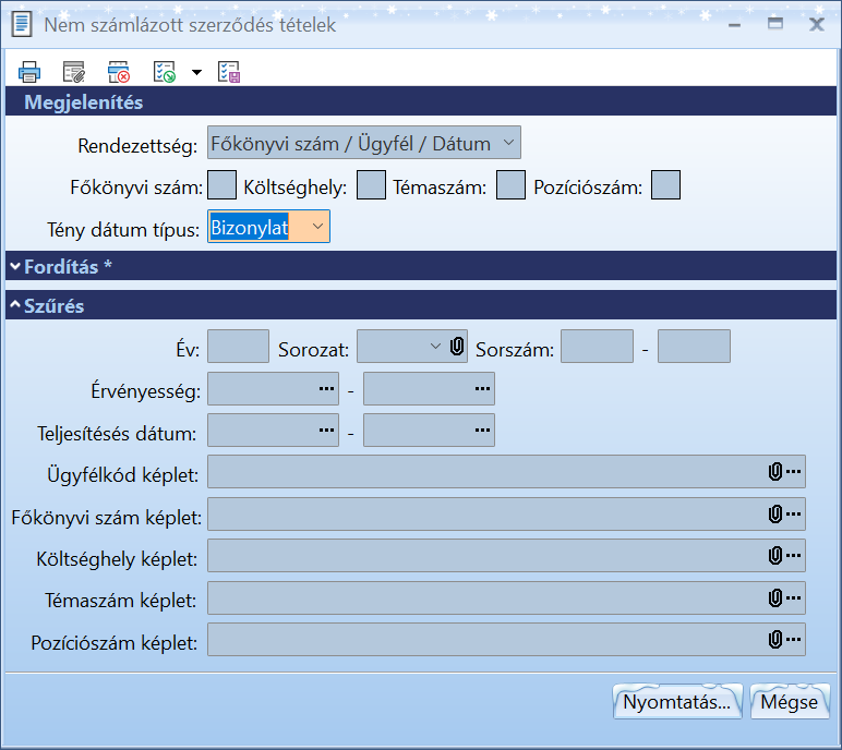 Funkció elérése menüszerkesztéskor: Szerződés-nyilvántartás / Nem számlázott szerződés tételek