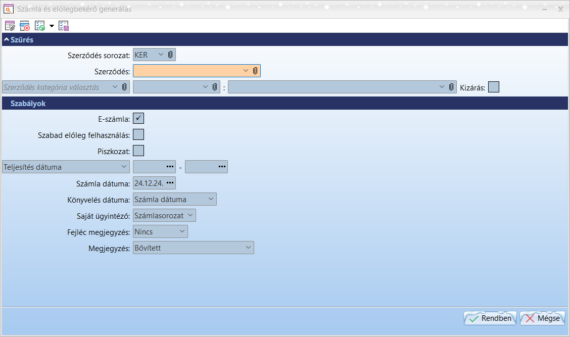Funkció elérése menüszerkesztéskor: Szerződés-nyilvántartás / Szerződés-számlagenerálás