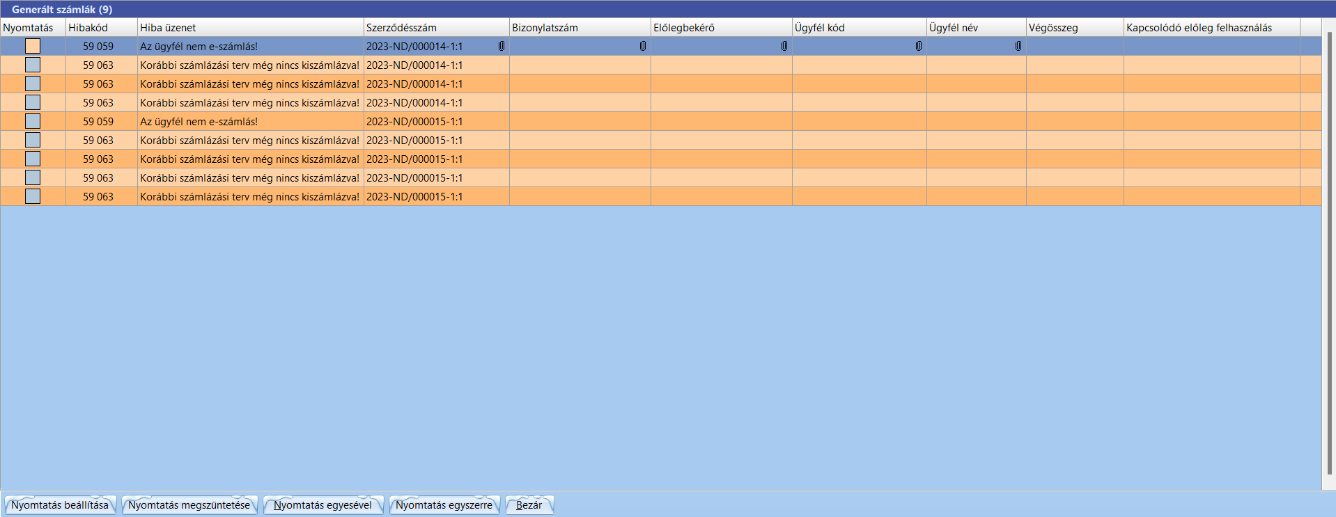 1. Amennyiben a vevőszámla sorozaton belül a generált nap utáni számladátummal már van felvéve számla, akkor nem lehet a megadott nappal a számlát legenerálni. Amennyiben a sorozaton belül csak a megadott napra van felvéve számla és utána nincs, továbbá a felvett számla nincs kinyomtatva, akkor kitörli a generálás a korábbi számlát! Amennyiben az aznapi számla ki van nyomtatva, akkor ugyan aznapra folytatódó sorszámozással hozza létre a további számlákat a generálás.