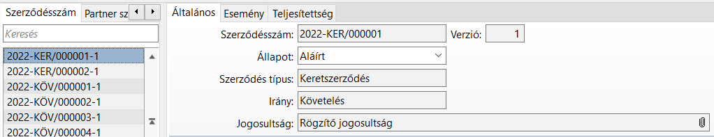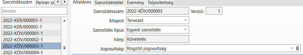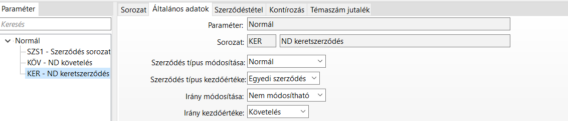 A típus és az irány mezők értéke a Szerződés funkció Általános fülén tekinthetőek meg.