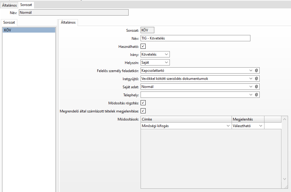 A Sorozat fülön többek között a létrehozni kívánt sorozat nevét és irányát szükséges meghatározni. Az irány mező értéke a TIG számlázási tervhez funkcióban nem módosíthatóan, csak tájékoztató jelleggel kerül megjelenítésre.