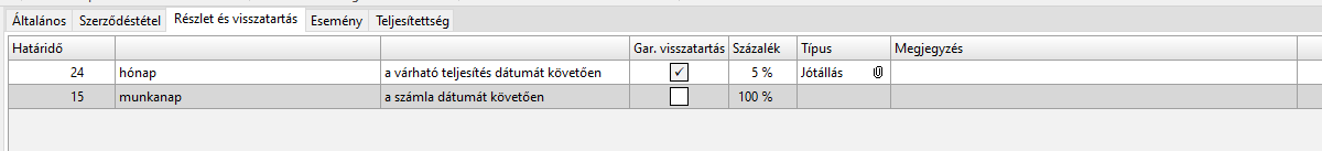 Jelen teljesítés nettó összege * Százalék kerül megjelenítés a mezőben. A százalék a TIG-hez kapcsolt szerződés Részlet és visszatartás fülén megadott garanciális visszatartás százaléka.