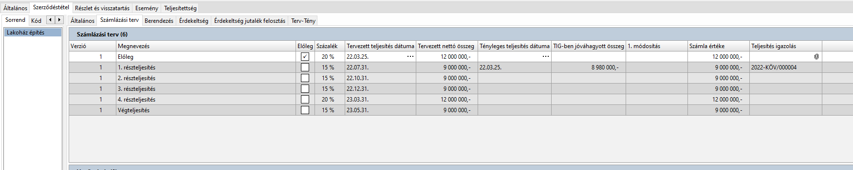 Az 1. részteljesítés elnevezésű tervsorból készült TIG. A számlázási tervbe visszaírásra került a Tényleges teljesítés dátuma, a TIG-ben jóváhagyott összeg és a Teljesítés igazolás mezők értéke a teljesítés igazolásból.