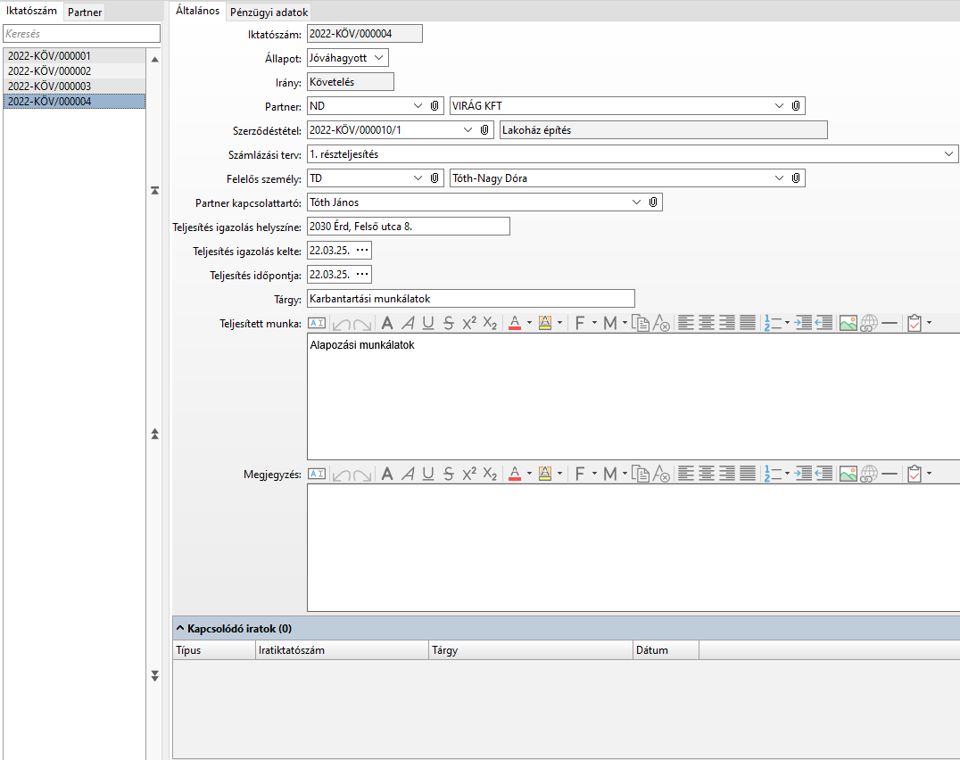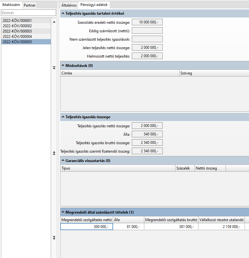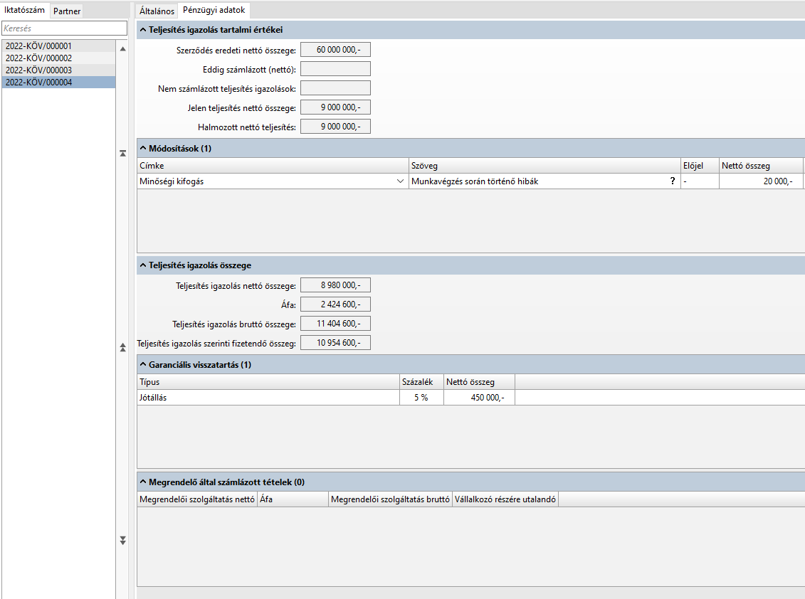 Az Általános fülön kiválasztott szerződésnek és számlázási tervnek hatására automatikusan és nem módosíthatóan kitöltésre kerülnek a Teljesítés igazolás pénzügyi adatai.