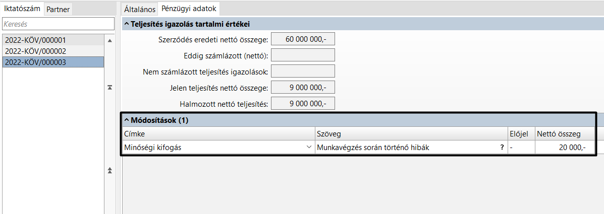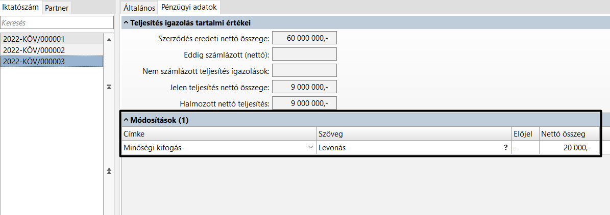 A teljesítés igazolásokon lehetőség van módosítás rögzítésére. Ezek lehetnek pozitív vagy negatív előjelű értékek is, attól függően, hogy például valamilyen minőségi hiba történt a munkafolyamatok során vagy valamilyen többlet munka került elvégzésre. Ezek az értékek a teljesítés igazolás rögzítését követően automatikusan átemelésre kerülnek a TIG-hez kapcsolt szerződés számlázási tervébe is.