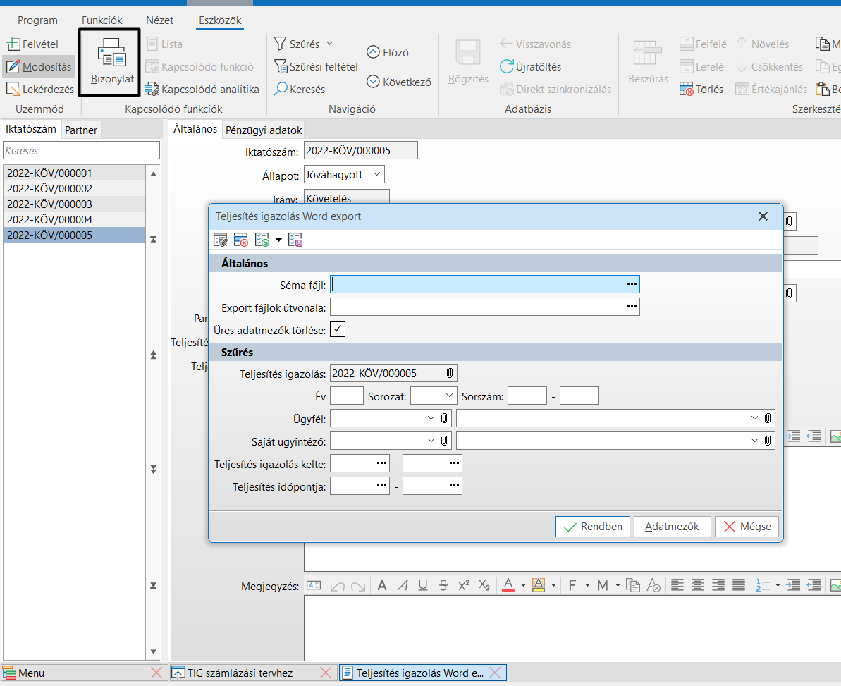 A TIG számlázási tervhez funkció Bizonylat gombjának megnyomását követően elindul a Teljesítés igazolás Word export művelet. A művelet segítségével egy megadott séma fájl kiválasztásával exportálni lehet a teljesítés igazolásban szereplő adatokat egy Word típusú séma fájlba.