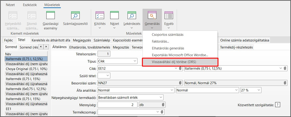 Ha rögzítés után, de nyomtatás előtt szükséges módosítani a vevőszámlán, akkor első lépésként vegyük le a visszaváltási díj tételeket a számláról. Ehhez, a vevőszámla funkcióban készült egy új művelet, amivel egy mozdulattal letörölhető az összes visszaváltási díj az adott bizonylatról. A Visszaváltási díj törlése (DRS) a Generálás művelet alatt érhető el.