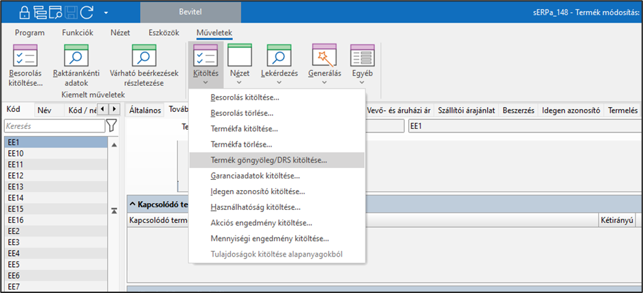 A szűrést követően a Műveletek -> Kitöltés -> Termék göngyöleg/DRS kitöltése kitöltése lehetőséget válasszuk.