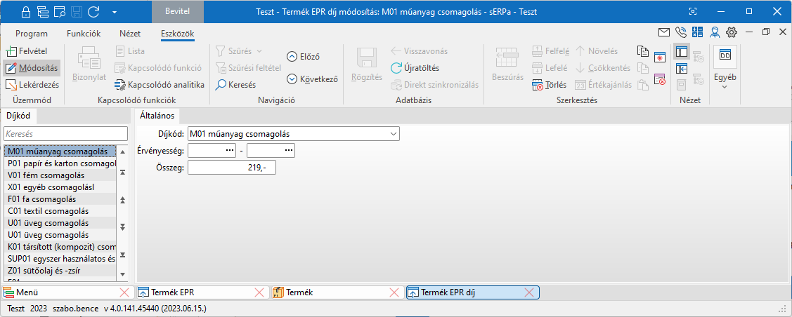 Emellett fel kell venni az EPR díjat, a díjkód alapján. A díjkódot és az összeget a hivatkozott jogszabályban találhatjuk. A programban csak a díjkódokat vettük fel és kapcsoltuk össze az anyagáram és csoport kódokkal.