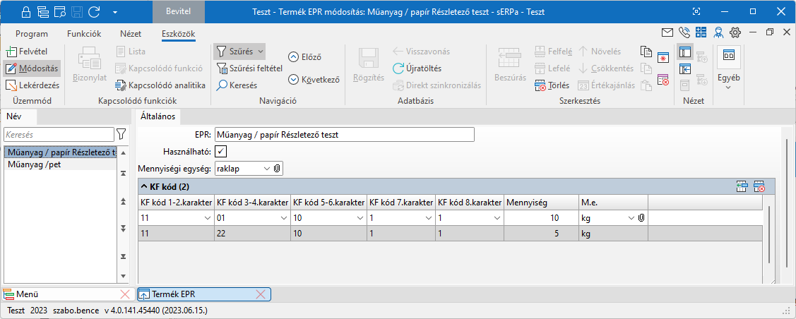A fenti beállítások alapján van egy EPR csomagunk, melyben két KF kód van megadva, azoknak pedig 1-1 mennyisége. A mennyiségi egység általában kg. A Fejlécen megadott Mennyiségi egység az átváltáshoz szükséges.