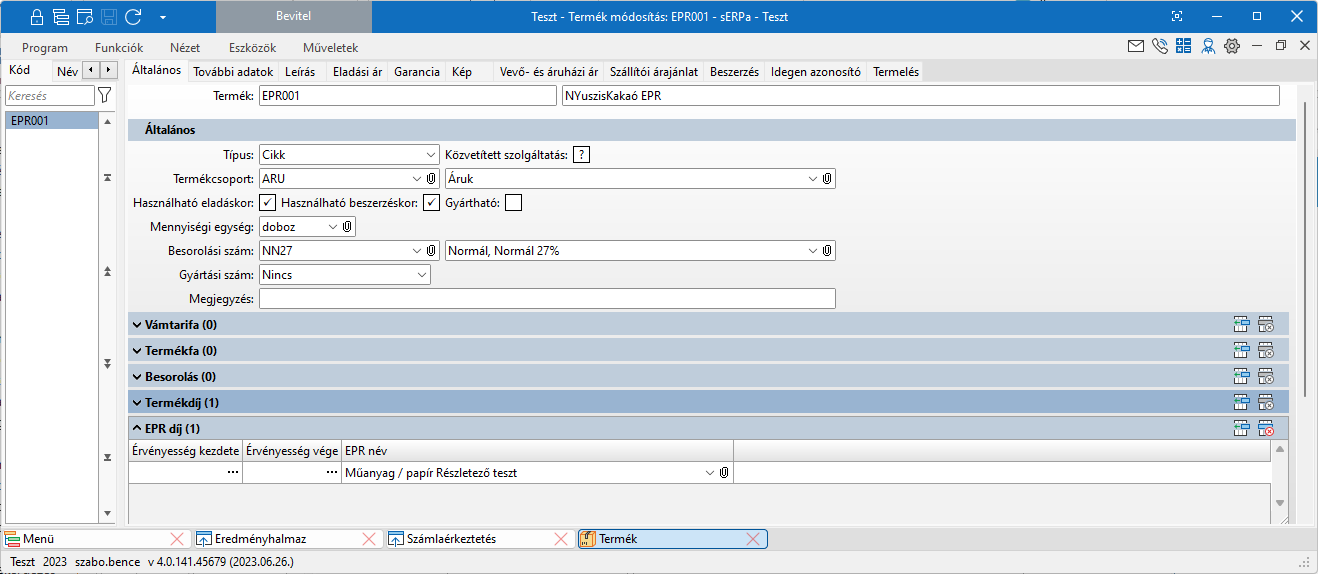 A funkció Általános fülén új EPR díj táblázat található, amelyben megadhatóak a termékhez tartozó EPR díj típusok és érvényességük, Cikk típusú termékek esetén. |