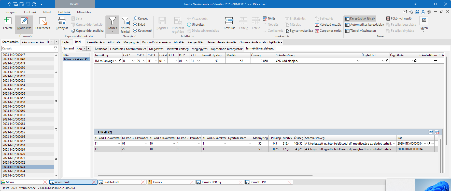 Bizonylat rögzítésekor a fent felvett adatok alapján a program végigszámolja, hogy az adott tétel, adott EPR kódjában lévő KF kódok milyen mennyiséggel szerepelnek a bizonylaton és ahhoz kiszámolja, milyen mértékű EPR díj fizetési kötelezettség keletkezik.