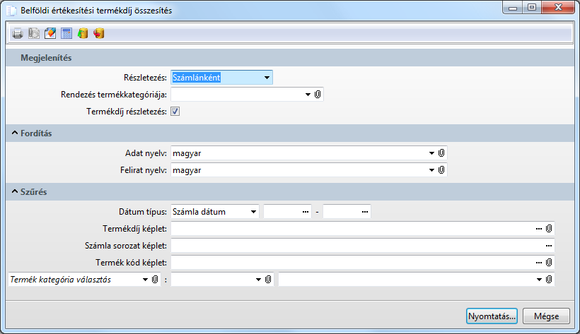 A funkció az adott időszakra vonatkozóan az értékesítést terhelő termékdíj analitikáját mutatja meg a vevőszámlák alapján. A termékdíjat a struktúrában vehetjük fel és a termék bevitelben rendelhetjük a cikk típusú termékekhez. Az előlegszámlák nem kerülnek a listába. Hasonló a Belföldi értékesítés termékdíj listához, de ez nyomtatható termékre összesítve is. A lista csak excelbe készül, mert a különböző termékdíjak egymás mellet szerepelnek, így az oszlopok száma változhat.