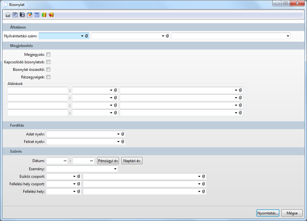 A tárgyi eszköz 'Bizonylat' lista eseményenként jeleníti meg az eszközre - az esemény hatására kialakult - jellemző nyilvántartási értékeket, értékváltozásokat az Érték (Bruttó / Nettó) , Maradványérték, ÉCS (terv szerinti / terven felüli, adó / számviteli törvény szerinti) és az Értékhelyesbítés mezők szerinti bontásban, továbbá Nyilvántartásba vétel és Aktiválás esetén megjeleníti az eszközre jellemző leírási módokat és kulcsokat. Továbbá informál az eszköz fellelési helyével kapcsolatos régi és új fellelési helyekről amennyiben Nyilvántartásba vétel, Aktiválás, Fellelési hely váltás, vagy kivezetés esemény történt. A bizonylat aláírható, lefűzhető. Aláíróként a tárgyi eszköz funkció általános fülének saját ügyintéző mezőjében megadott személy kerül megjelenítésre.