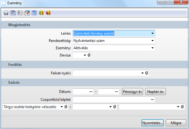 A tárgyi eszköz 'Esemény' lista a főkönyvvel való egyeztetést segíti egy, vagy több tárgyieszköz-csoport meghatározott eseményeinek a kinyomtatásával, összesítésével.