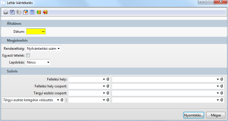 Funkció elérése menüszerkesztéskor: Tárgyi eszköz / Leltár kiértékelés lista