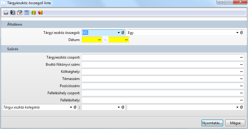 Funkció elérése menüszerkesztéskor: Tárgyi eszköz / Tárgyieszköz összegző lista